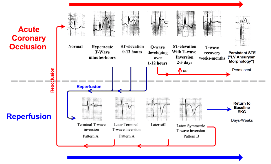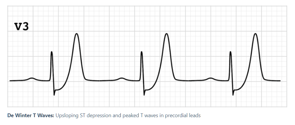 The de Winter pattern is seen in ~2% of acute LAD occlusions. Typical STEMI morphology may precede or follow the de Winter pattern