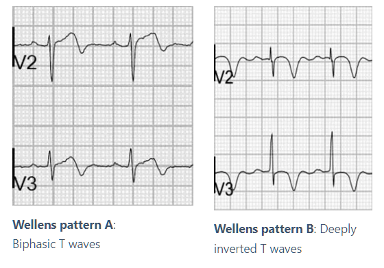 - Deeply inverted T-waves in leads V2 and V3 (75% of patients)